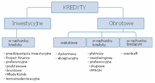 Podział kredytów gospodarczych udzielanych przez banki przedsiębiorstwom, wraz z przykładowymi nazwami kredytów, można również przedstawić graficznie (rysunek 3).