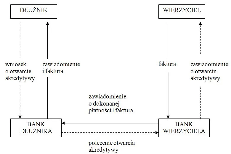 Podstawą otwarcia akredytywy jest wniosek dłużnika założony w oddziale jego banku, a wskazujący wierzyciela (dostawce) i oddział banku wierzyciela, w którym będą dokonywane wypłaty.